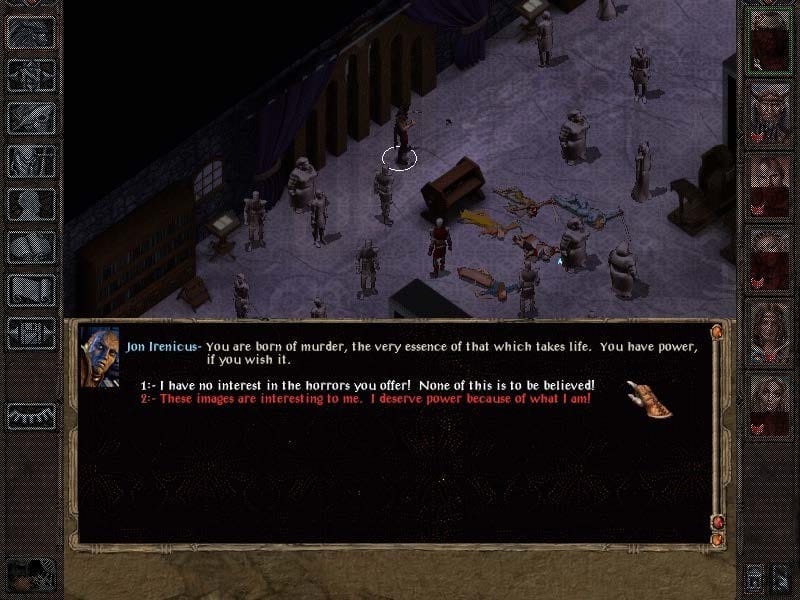 Câu chuyện mở ra khi Irenicus, một tên pháp sư quyền năng, biết tới thân phận kì lạ của nhân vật chính và khao khát "mở khoá sức mạnh của bạn" cho tham vọng bá chủ của hắn. Tài tình là, bản chất của nhân vật phản diện được che giấu một cách khéo léo qua thái độ vô cảm ban đầu. Đi kèm giọng lồng tiếng thượng hạng, lời thoại hùng hồn của hắn khiến tôi choáng ngợp.