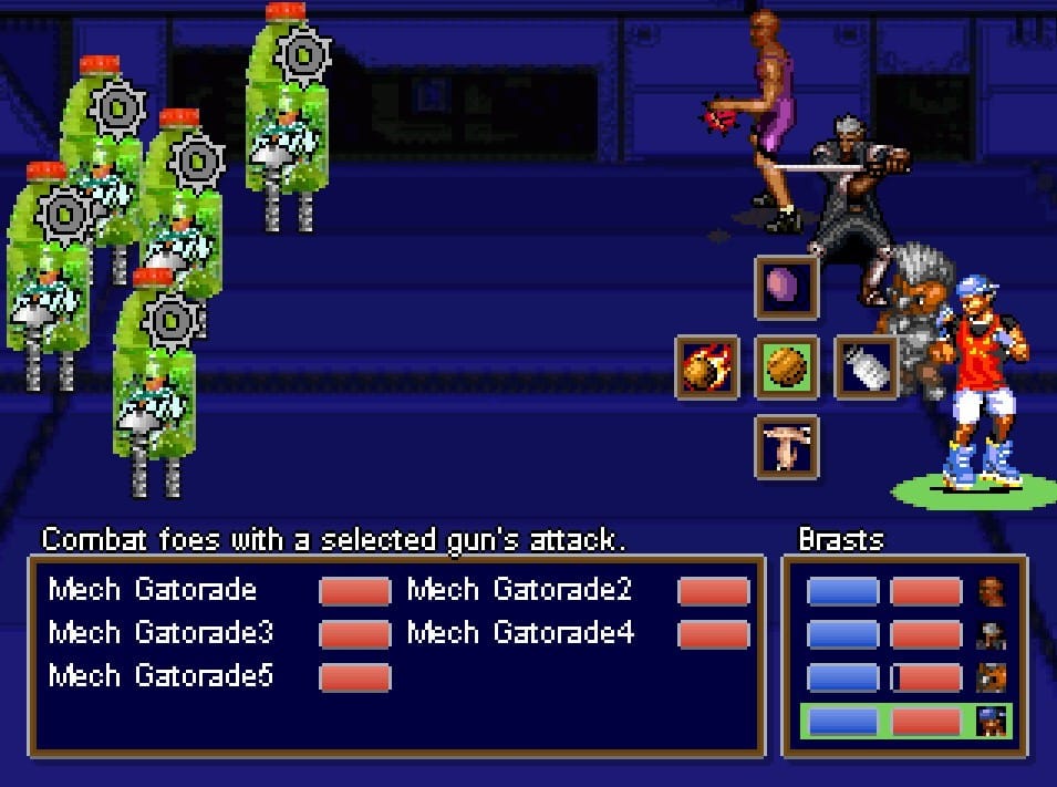 Cơ chế chiến đấu diễn ra theo lượt kiểu JRPG truyền thống, với tối đa bốn thành viên và nhiều đòn đặc biệt. Mỗi trận chiến cũng đều thấm nhuần sự lố bịch của thế giới này. Nhện bóng rổ, trọng tài xác sống và chai Gatorade robot sát thủ mới chỉ là một vài kẻ địch mà bạn sẽ chạm trán.