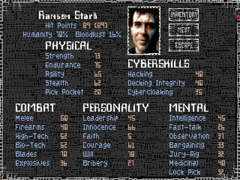Vì là nửa người nửa ma cà rồng, Stark có hai chỉ số: humanity (nhân tính) và bloodlust (khát máu). Bạn phải uống máu để kiềm chế cơn khát, nhưng mỗi lần cắn người, humanity của bạn sẽ giảm. Câu chuyện và hội thoại được viết khá hay và hấp dẫn. Ransom là một nhân vật hài hước, dàn nhân vật phụ cực kì đặc sắc, và ý tưởng kết hợp ma cà rồng/cyberpunk dần dần trở nên cuốn hút.
