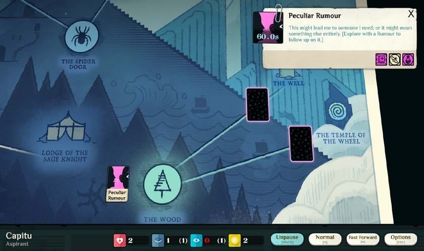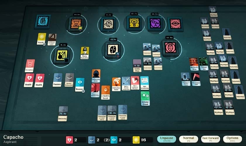 Đặt một lá Health vào ô Work, bạn sẽ nhận được một lá Fund. Lá Health lúc này sẽ bị kiệt sức và sẽ không thể dùng trong khoảng một phút. Đôi khi bạn có thể nhận về một lá Wound và buộc phải tìm cách chữa trị. Nghe thì có vẻ đơn giản, nhưng không phải mọi tổ hợp đều dễ thấy như vậy. Trò chơi không có hướng dẫn, thậm chí không có mục tiêu, ít nhất là lúc đầu game. Cultist Simulator là kiểu trò chơi mà mục tiêu chính của bạn là khám phá mục tiêu của game. Người chơi phải tự mình thử nghiệm, chấp nhận sa vào vài cái bẫy. Chẳng hạn như để tránh hoặc loại bỏ cảm giác Fear (Sợ Hãi), thứ sẽ dẫn tới Anxiety (Lo Âu) và thường là lí do những ván chơi đầu tiên kết thúc.