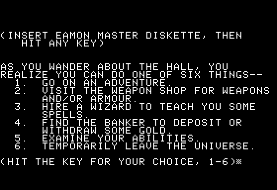 Đầu tiên, bạn bước vào Hội mạo hiểm giả, đăng kí tên và năng lực của mình, sau đó mua vũ khí và áo giáp. Sau khi hỏi thăm một pháp sư gần đó để học một vài câu thần chú, bạn sẽ tiến vào sảnh phiêu lưu với nhiều cửa. Mỗi cánh cửa lại dẫn đến một cuộc phiêu lưu khác, ở một bối cảnh khác, do một người khác viết nên. Chào mừng đến với Eamon!
