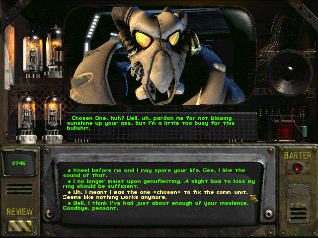 "Bạn sẽ có thể cho vợ đi bán dâm ở New Reno!" Trong lúc ngấu nghiến đọc một tạp chí về trò chơi điện tử, những dòng chữ trên là ấn tượng đầu tiên của tôi về Fallout 2. Chẳng lời nào có thể diễn tả sự phấn khích của tôi trước nhận định đó: lúc đó tôi còn trẻ, định hướng đạo đức chưa rõ ràng và lại còn bị rối loạn nội tiết tố, những chứng bệnh mà hầu hết đám choai choai trạc tuổi tôi đều bị. Lẽ dĩ nhiên là tôi ngay lập tức chết mê chết mệt Fallout 2.