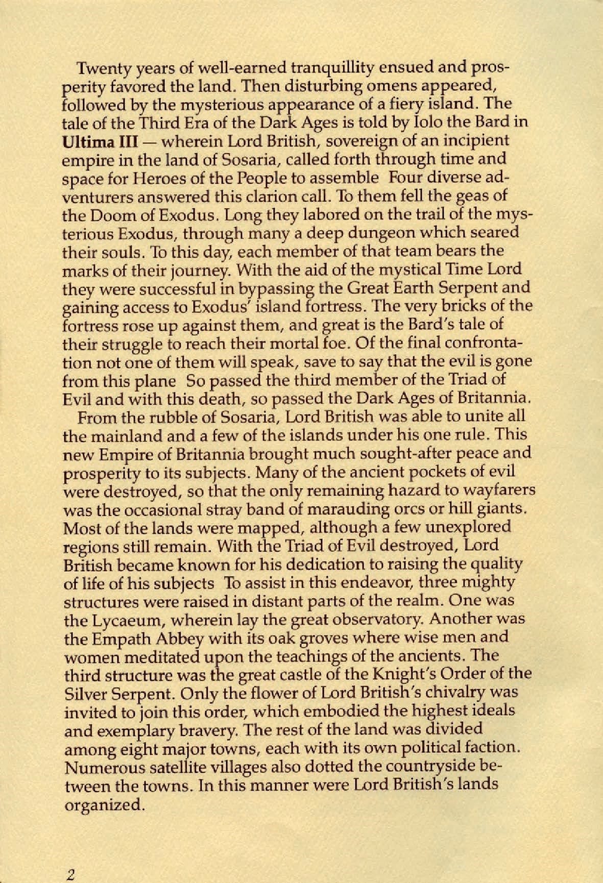 Hai trang từ cuốn sổ tay "History of Britannia" của Ultima IV đi kèm với mỗi bản game: