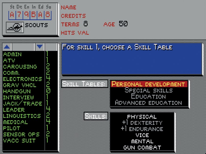 MegaTraveller sở hữu một trong những quy trình tạo nhân vật chi tiết nhất trong lịch sử. Bạn có thể mất đến hàng tiếng ở đây. Sau khi gieo chỉ số (vô số lần), bạn có thể thử đăng kí vào một trong năm quân chúng chính (Lính thuỷ đánh bộ, Bộ binh, Thủy quân, Thương gia và Do thám) hoặc đăng kí nhập ngũ. Và đăng kí vào một nhánh chưa phải đã xong: ví dụ muốn làm Lính thuỷ đánh bộ rất khó và kể cả nếu được nhận, rất có thể bạn sẽ được giao nhiệm vụ làm anh nuôi theo đúng nghĩa đen, phải đứng gọt khoai tây cả kì.