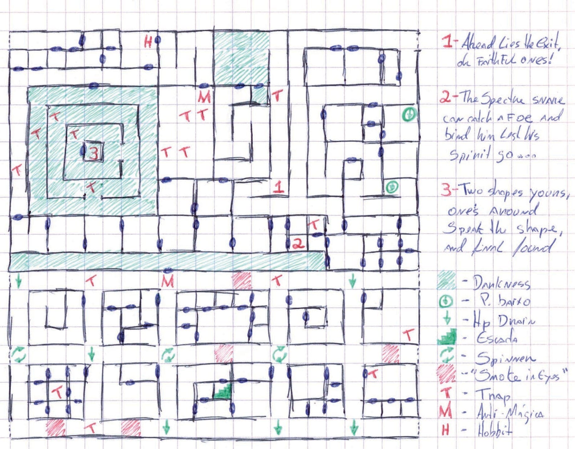 Tất nhiên, điều đó cũng có nghĩa là mỗi khu vực đều có 256 bước nhỏ và từng bước đều được ghi chú cẩn thận. Đương nhiên là có kèm theo ghi chú, chỗ nào có vật phẩm, bẫy nằm ở đâu, thông điệp hiện ra ở điểm nào (và nội dung là gì), v.v. Mà cứ được vài bước là phải chiến đấu với bầy đàn quái vật (không hiểu sao Quái vật tụ theo bầy lại là chi tiết xuất hiện trong mọi RPG luôn; lũ tiểu yêu này chăm chỉ gớm!)