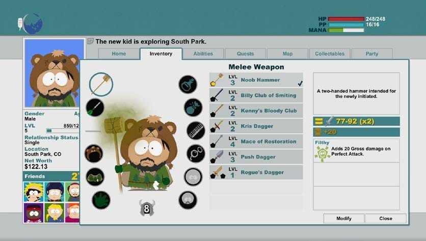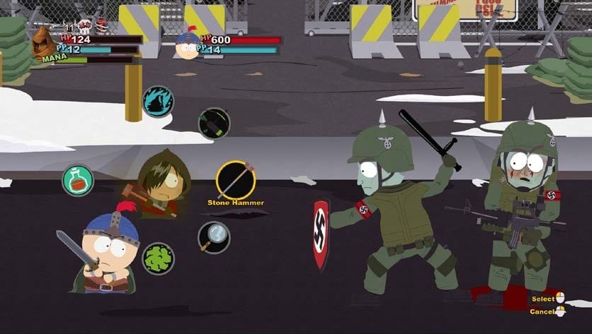 Dù vậy, yếu tố thực sự khiến The Stick of Truth mang đúng tinh thần của bộ phim nằm ở nhịp độ. Thể loại RPG thường có xu hướng dài dòng, thừa chữ và nhồi nhét quá nhiều tình tiết vô nghĩa (một nhược điểm mà Obsidian hay mắc phải), nhưng ở đây ta lại có một tựa game ngắn, súc tích và nhịp độ nhanh – giống hệt phiên bản truyền hình. Đây là một trò chơi hài hước về lũ trẻ con chơi nhập vai, và mọi luật lệ, chỉ số, trận chiến cùng các mô-típ của thể loại đều trở thành công cụ để pha trò.