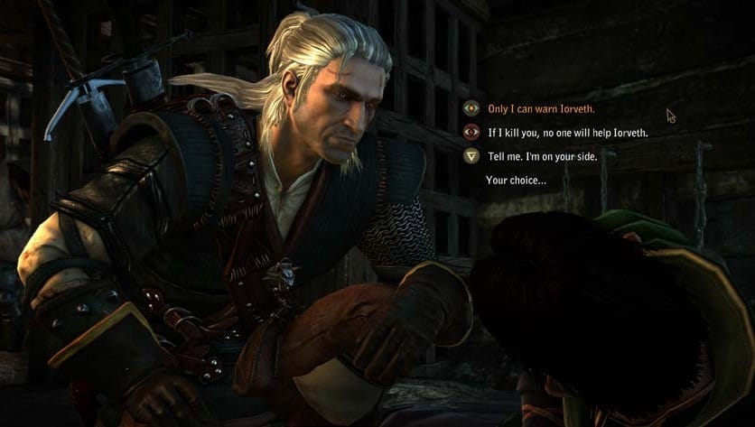 Một trong những điểm mạnh nhất của The Witcher 2 chính là cốt truyện, theo ý kiến của tôi thì vượt trội so với phần đầu. Yếu tố tạo nên sự độc đáo là khả năng trải nghiệm chương hai từ hai góc nhìn hoàn toàn khác nhau. Tuỳ vào lựa chọn ở chương một, Geralt sẽ rơi vào một thành trì người lùn đang bị bao vây, hoặc vào trại của đội quân đang bao vây thị trấn đó. Mỗi bên đều mang lại nhiệm vụ, tuyến truyện và góc nhìn riêng cho những sự kiện dần hé lộ.