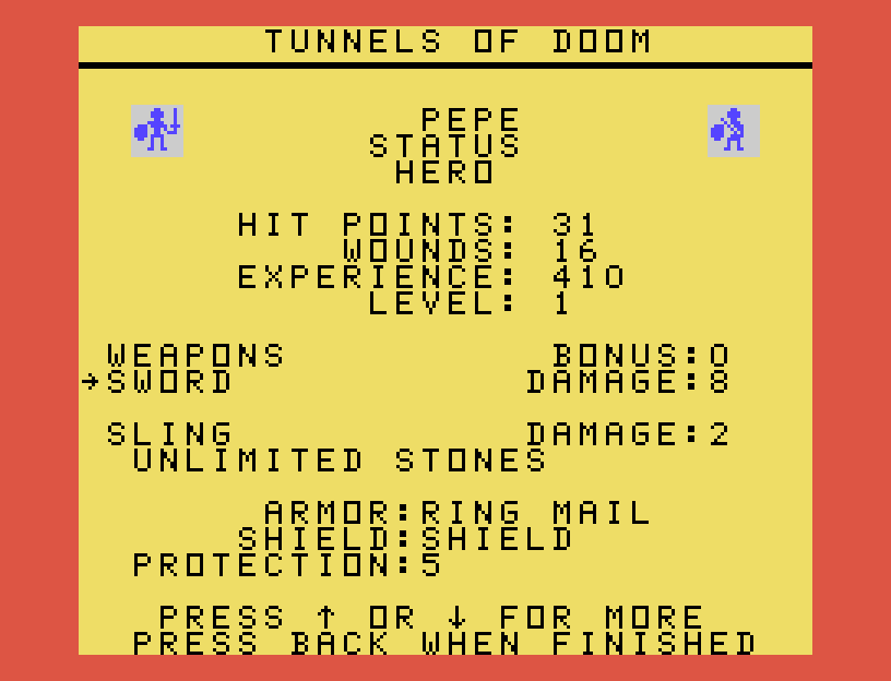 Tunnels of Doom đi kèm với một băng ROM chứa engine của game và hai đĩa (hoặc băng cassette), mỗi đĩa chứa một cuộc phiêu lưu. Sau khi tạo tổ đội của mình, bạn sẽ khám phá một hầm ngục được tạo ngẫu nhiên dựa trên cuộc phiêu lưu mà bạn đang chơi. Pennies and Prizes là một cuộc săn lùng vật phẩm đơn giản không có chiến đấu, trong khi Quest for the King yêu cầu bạn khám phá một hầm ngục đầy quái vật để giải cứu Nhà vua, trong một khoảng thời gian giới hạn.